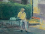 1992pasteltekening van een oude vriend gezeten op een geliefd plekske: het muurtje aan de brug over de beek, in zijn dorp.
